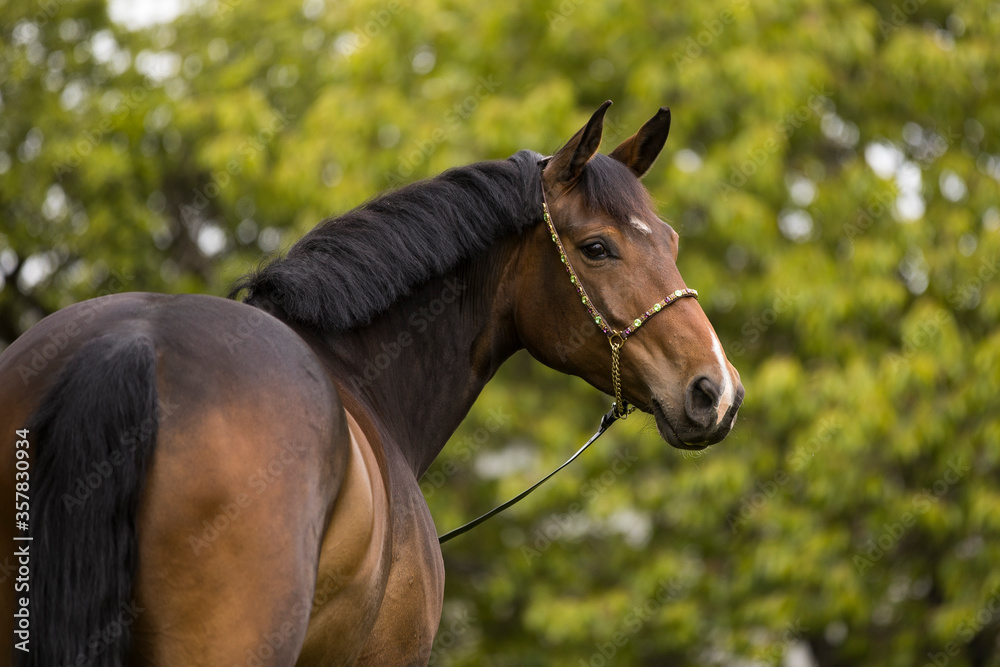 Braune Holsteiner Stute im Portrait mit Schmuckhalfter vor grünem Laub