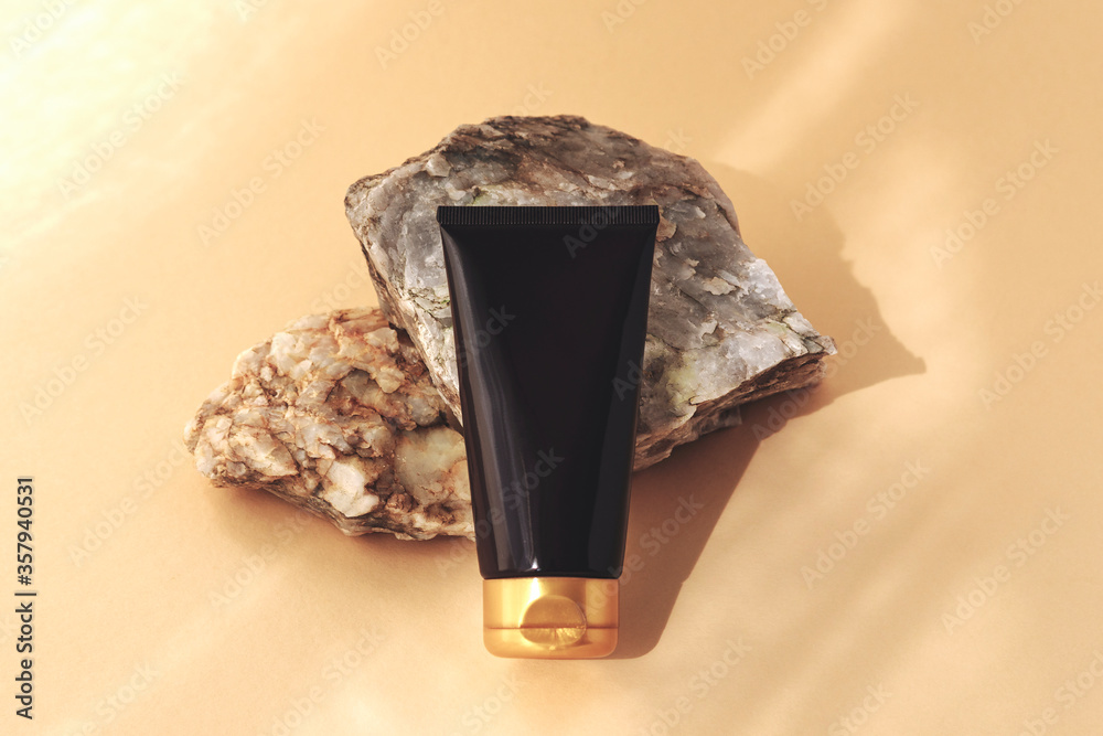 Cream tube for body or face care blank brown package, stone background. Natural skin care product