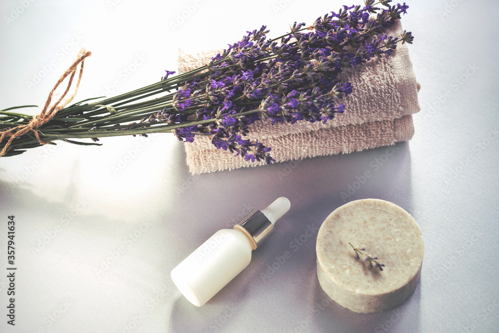 Cosmetic natural lavender soap bar and serum or essential oil. Aromatherapy, spa concept. Top view