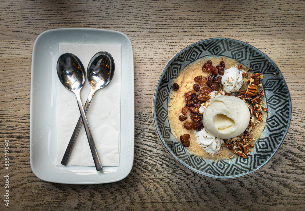 Top view of a greek halva - semolina with raisins, chopped nuts and ice cream on a plate on a vooden table.