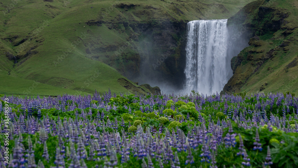 Colorful lupine fields in front of the iconic Skógafoss waterfall in South Iceland.