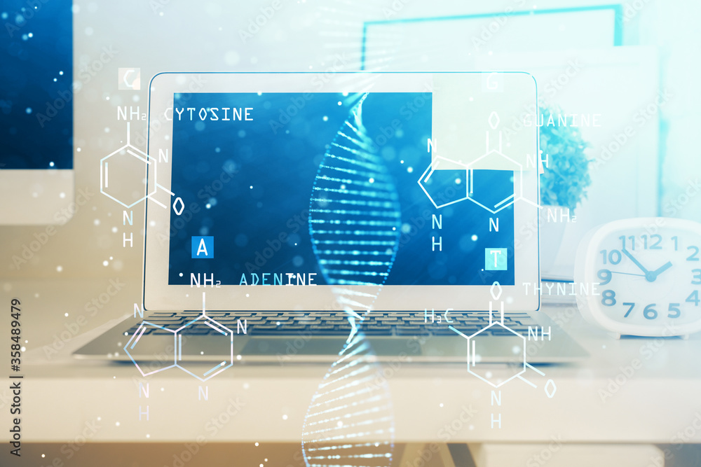 Desktop computer background and DNA drawing. Double exposure. Science concept.