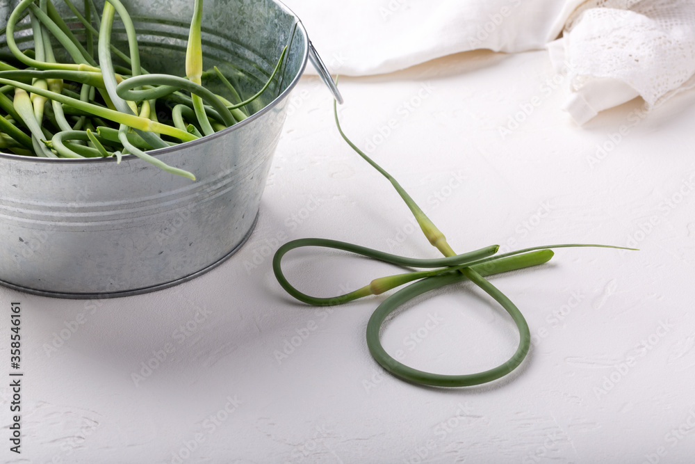 Garlic arrows in metal bowl on white. Heap of green stalks of fresh young garlic. Food ingredient.