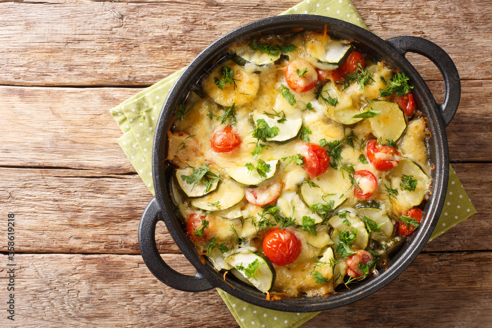 Zucchini summer casserole with cheese and cherry tomatoes close-up in a pan. Horizontal top view