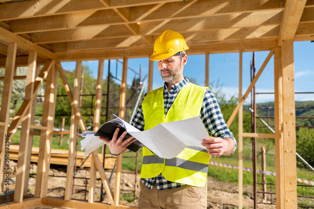Construction engineer or architect with blueprints visiting building site of wood frame house