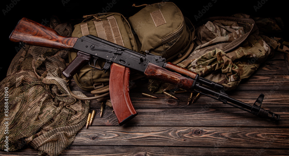 Classic Soviet AK machine gun on a wooden back. Weapons of Russia and the Soviet Union.