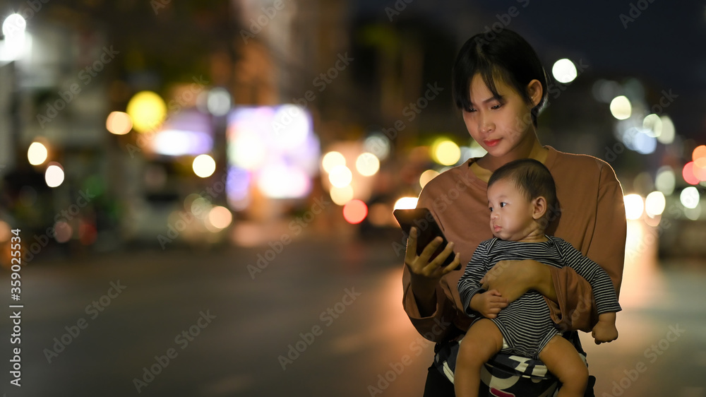Asian woman and baby wait for her private taxi by using a transportation app on the night street.