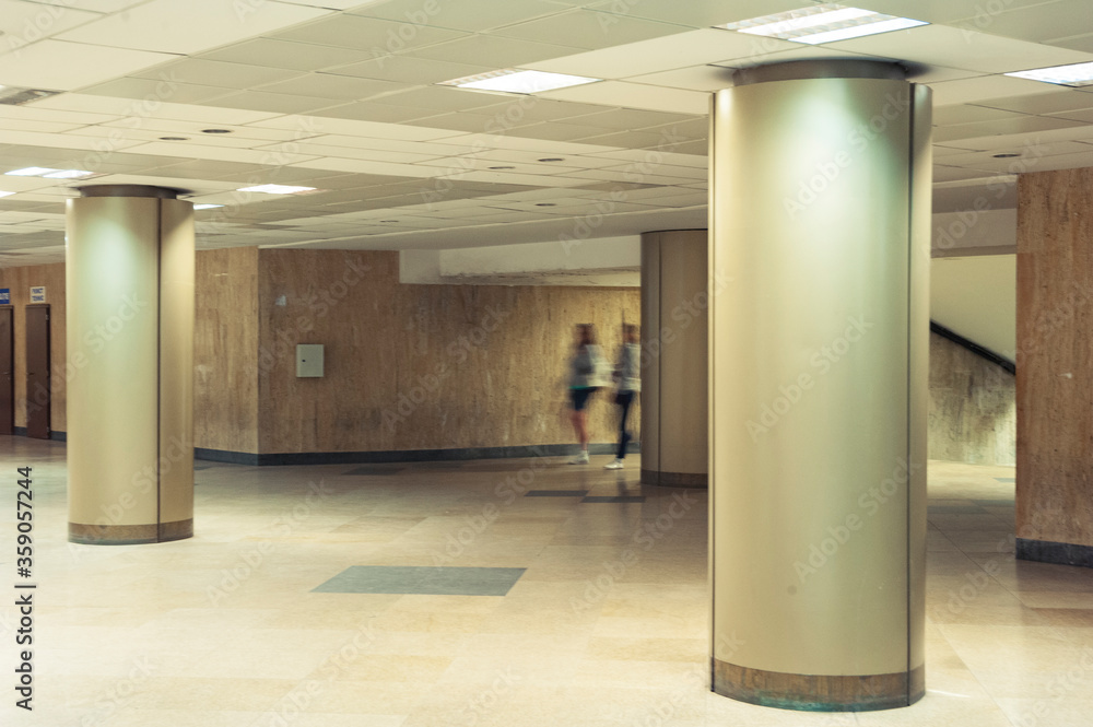 Motion blurred persons coming out of the subway station in an underground pedestrian passage.