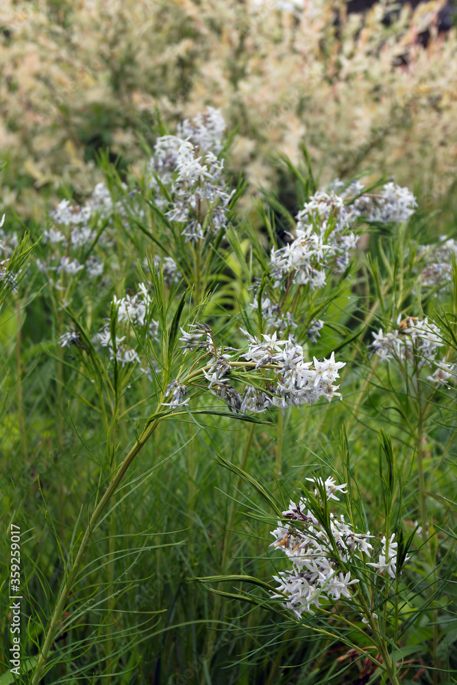 Vertical image of a side view of Arkansas bluestar (Amsonia hubrichtii) in flower, with a clump of dappled willow (Salix integra 'Hakuro Nishiki') in the background