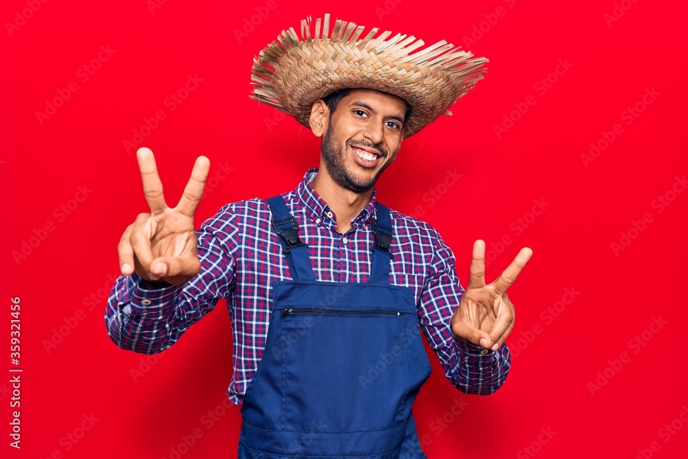 Young latin man wearing farmer hat and apron smiling looking to the camera showing fingers doing victory sign. number two.