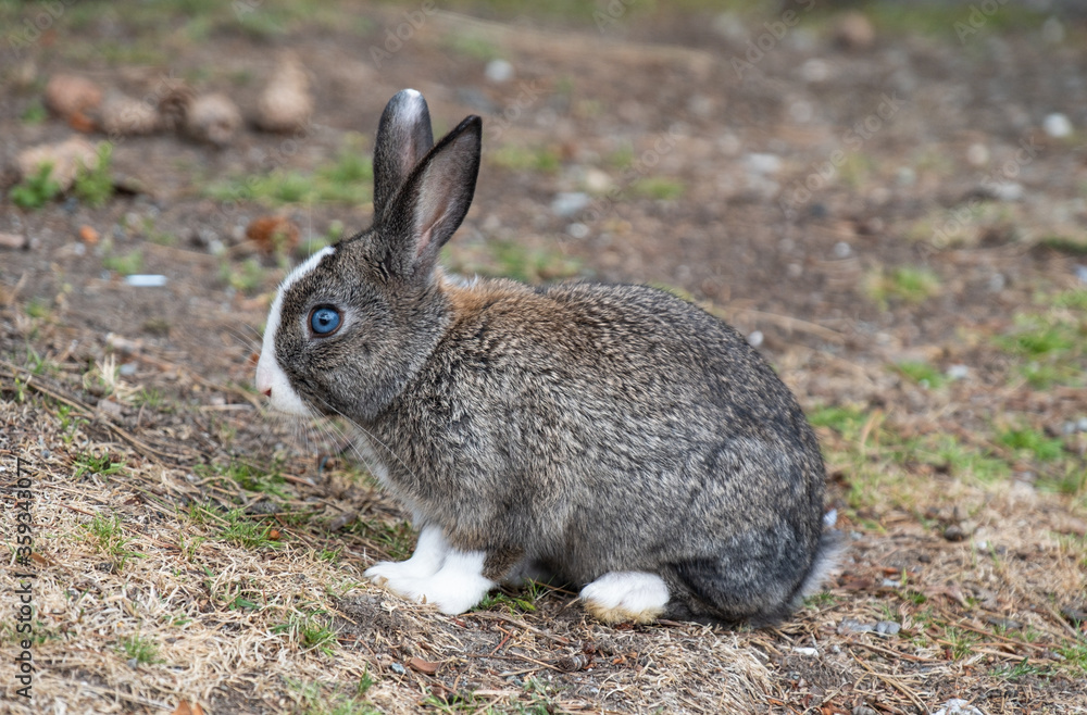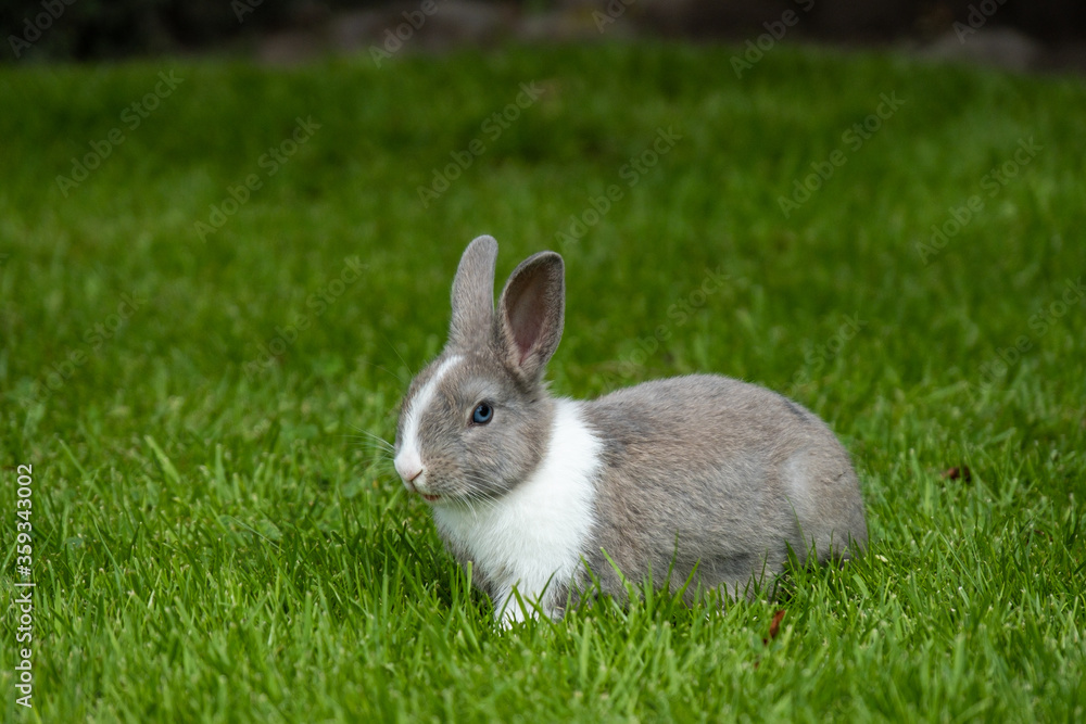 side portrait of an adorable grey bunny with white fur on the chest and forehead laying on the green grass field