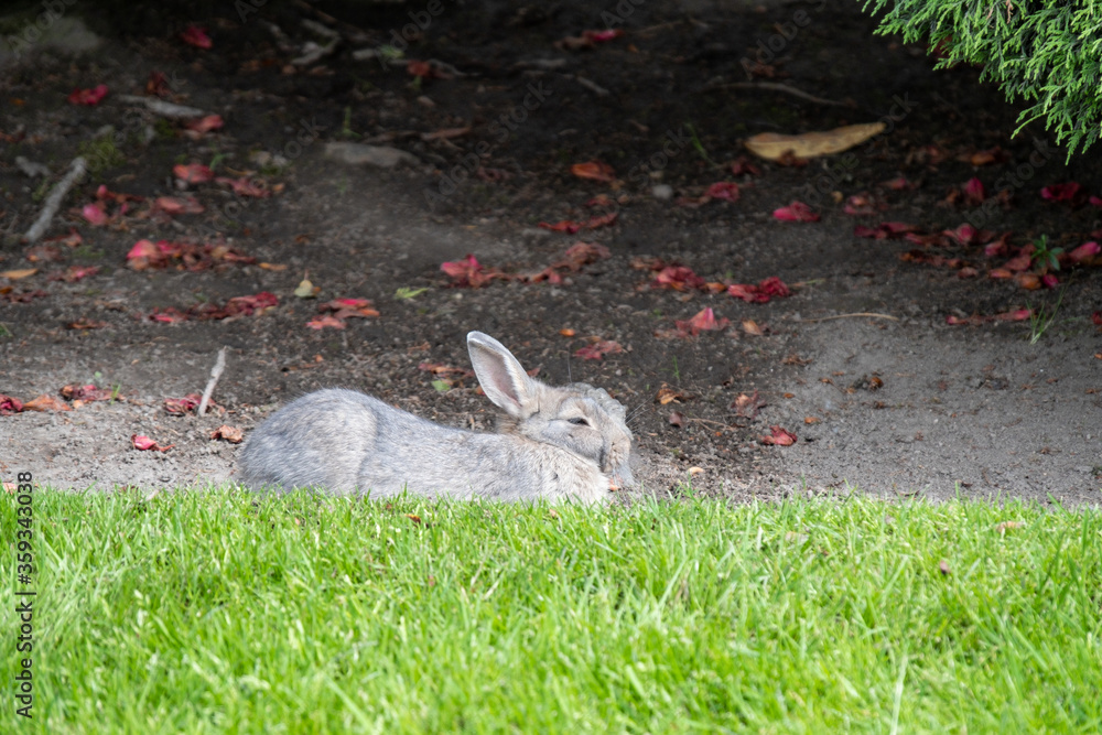 one grey rabbit laying behind green grass filed under the shade of the bushes taking its nap