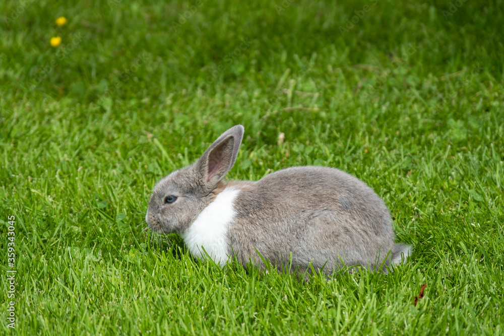 an adorable grey bunny with white fur on the chest and forehead eating on the green grass field