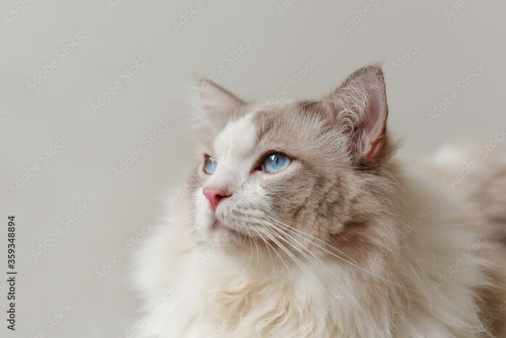 Cute Ragdoll cat side face, blue eye, pink nose, grey background