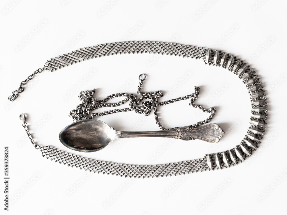 workshop for cleaning tarnished silver with aluminum foil and baking soda - tarnished vintage silver spoon, necklace and chain on white paper