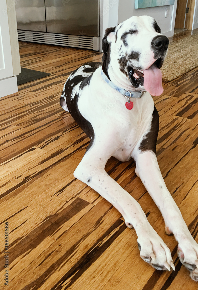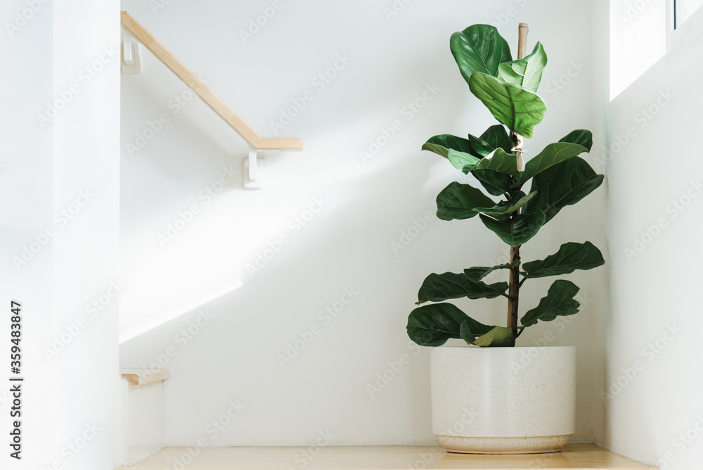 Fiddle leaf fig, Ficus lyrata, plant in circle white pot and place at the Corner of stair or ladder for decorate home or room. And there is sunlight coming from the right hand window.