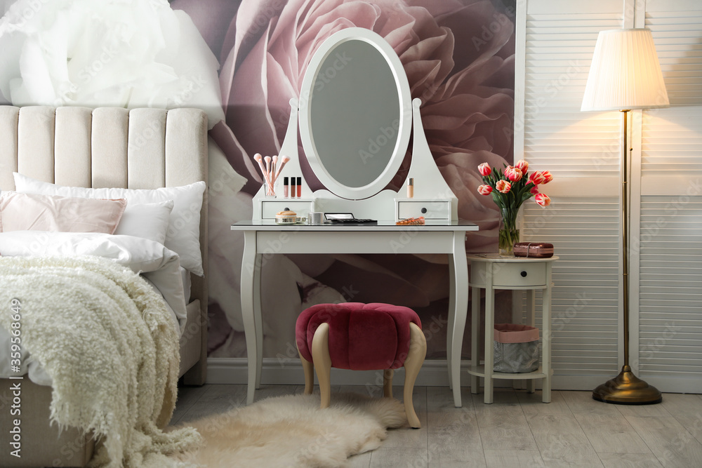 Stylish bedroom interior with elegant dressing table and floral wallpaper