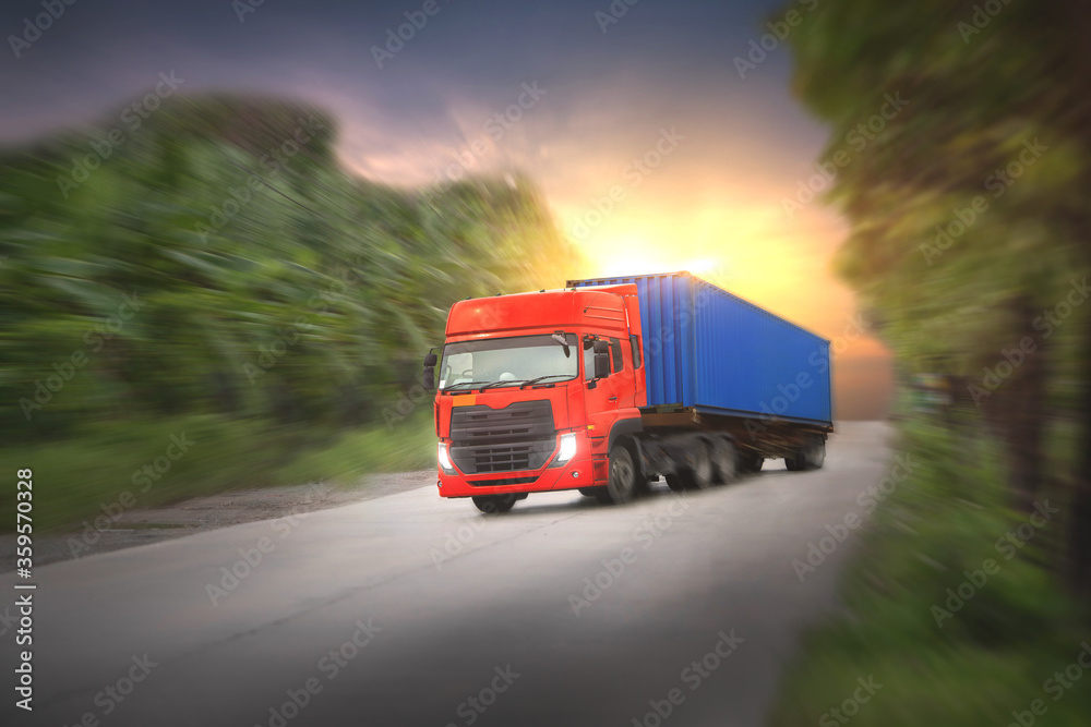Transportation industry Container truck traffic on the highway on a beautiful and cloudy day.