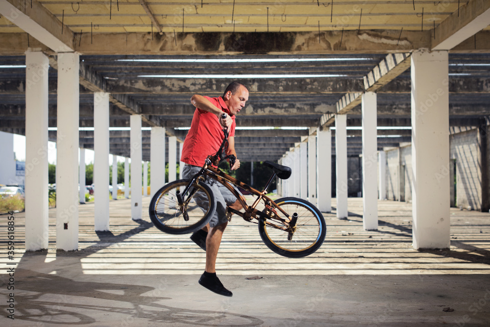 Man in color t-shirt on the bike. Bmx rider performing tricks at street with striped shadow from the sun