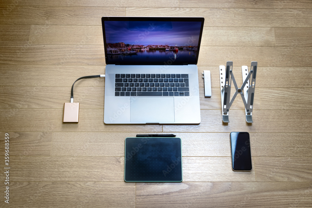 Top view of a laptop with a drawing graphic tablet, a mobile phone, a foldable stand, a ssd hard disk and a hub adapter.