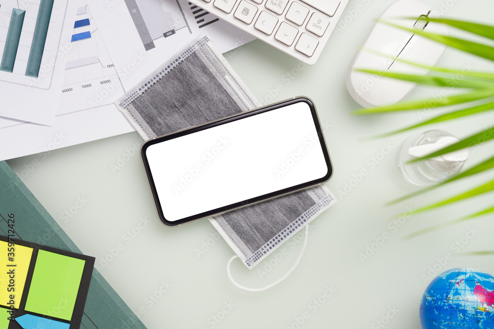 Mockup blank white screen smartphone for Coronavirus Covid-19 background concept. Can use for business impact, economic impact, work from home background.