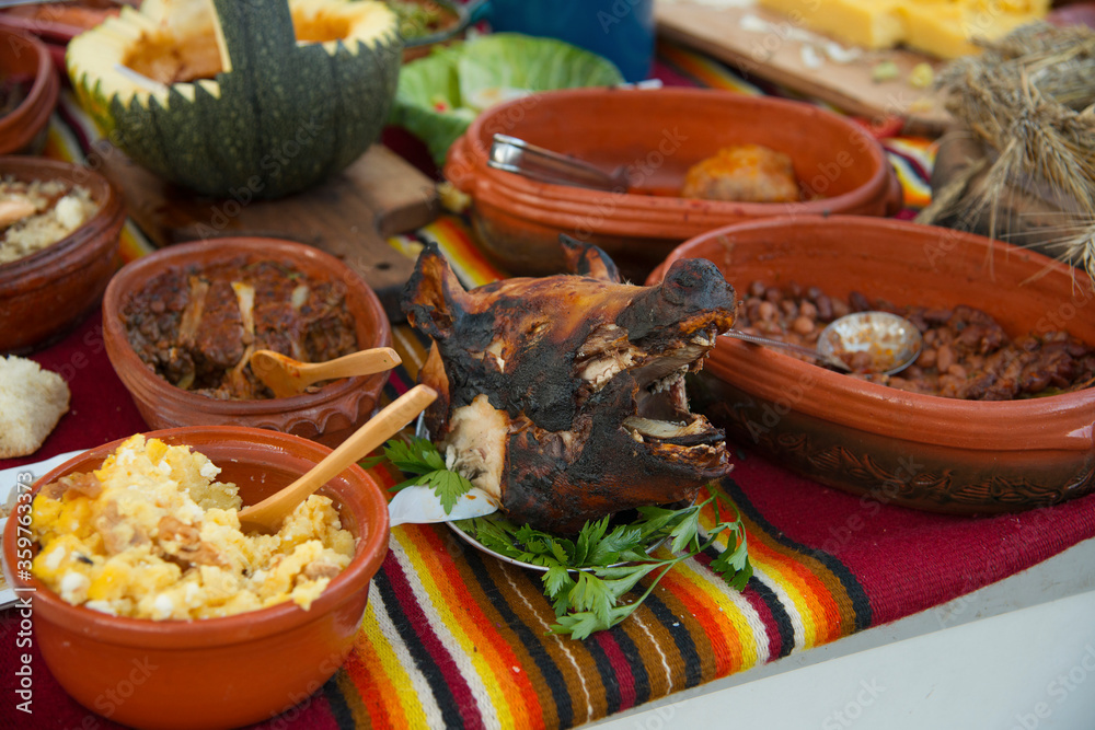 Traditional dishes served in traditional clay pottery with roasted pigs head in the center