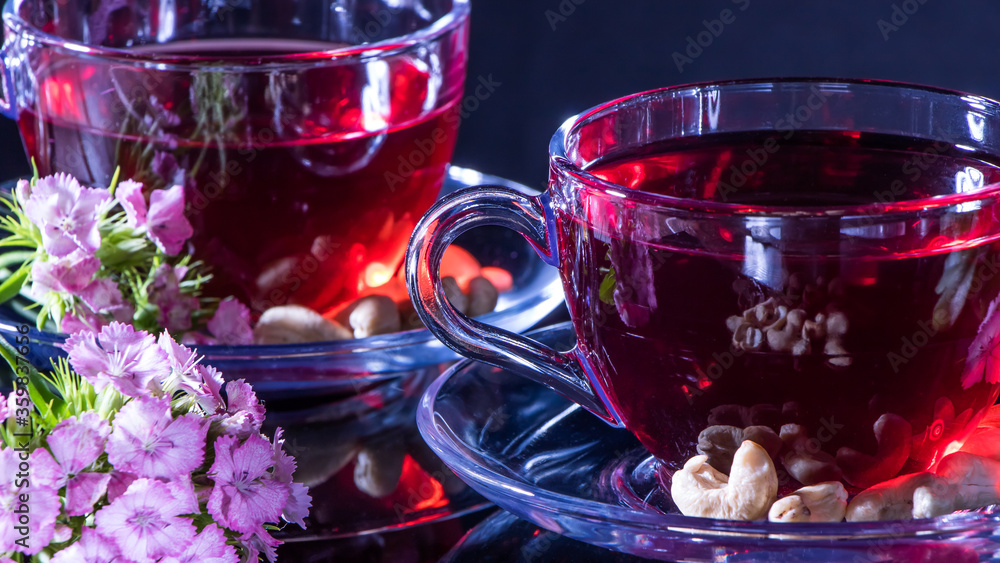 Hibiscus Red tea mug with carnation flowers close-up horizontal photo.English tea tradition.Medicinal therapy based on medicinal herbs and decoctions.Spicy herbs and medicinal broths.A relaxing drink