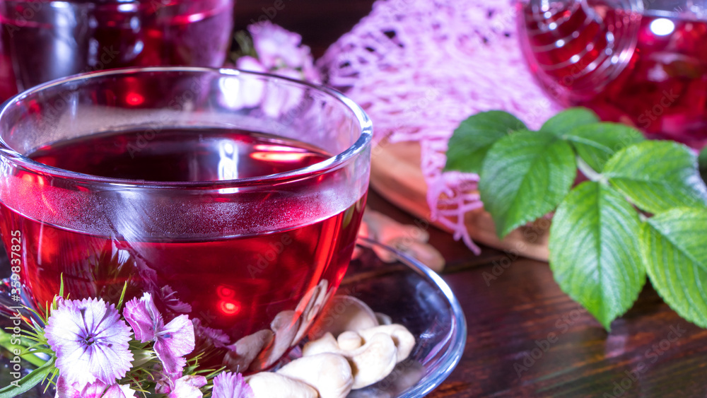 A mug of red tea in white hibiscus flowers and green leaves of medicinal tea on a wooden stand.Zen tea ceremony. Photo of red herbal Indian healing tea. Elegant mugs with a relaxing and tonic drink