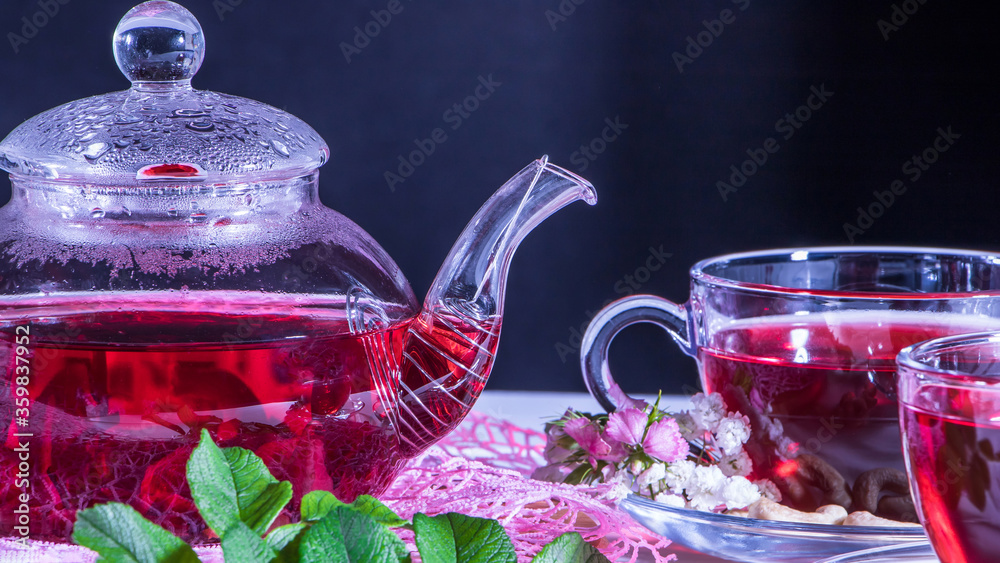 Hot luxury tea with a pleasant smell in a cozy home.Relaxing drink.Teapot, mugs of tea, cashew nuts, clove flowers and green medicinal leaves. Tea ceremonies and traditions in Japanese and Zen style