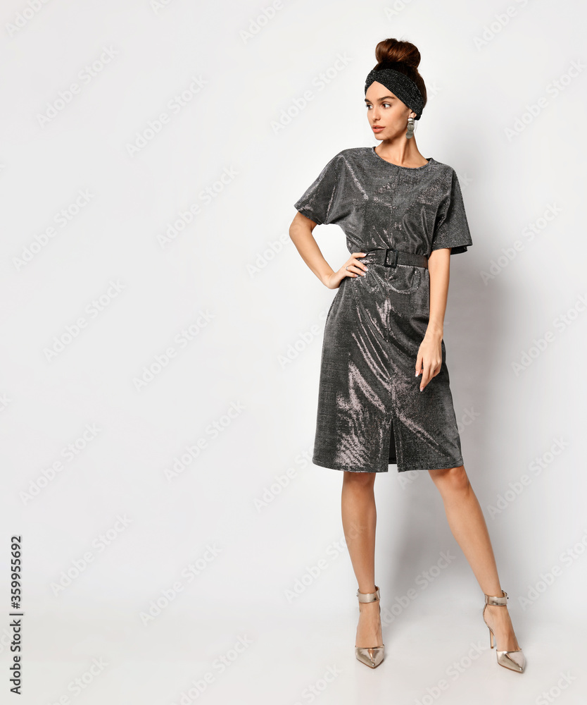 Stunning confident young female looking aside with hand on hip in luxurious metallic grey dress, headband and high heels, isolated on white