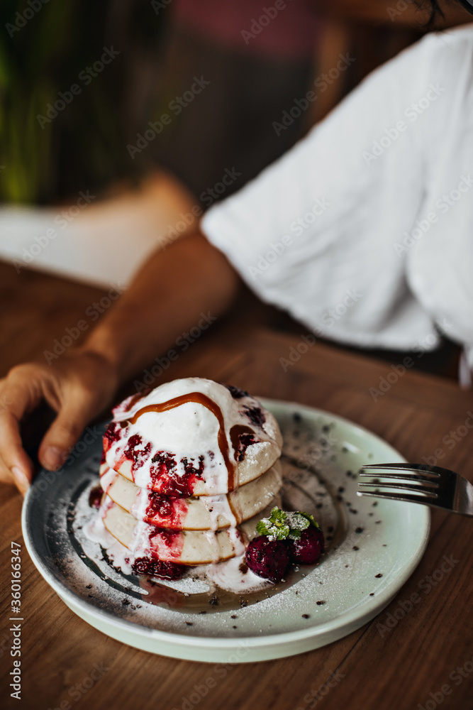 Food photo of pancakes with strawberry sauce and ice cream on white plate. Woman holds fork and sits in cafe