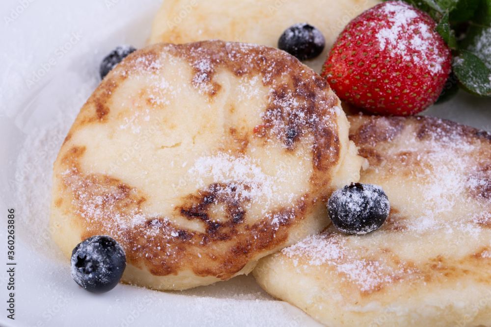 Fried cheeses with blueberries and strawberries in powdered sugar