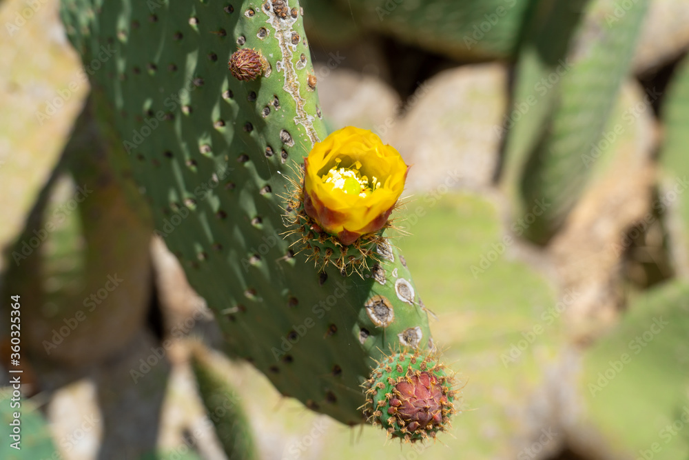 Close up of Opuntia, commonly called prickly pear, is a genus in the cactus family, Cactaceae.