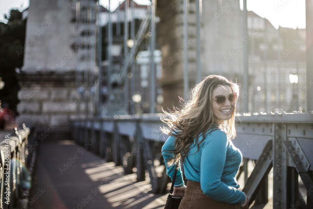 Blonde girl is walking on the bridge