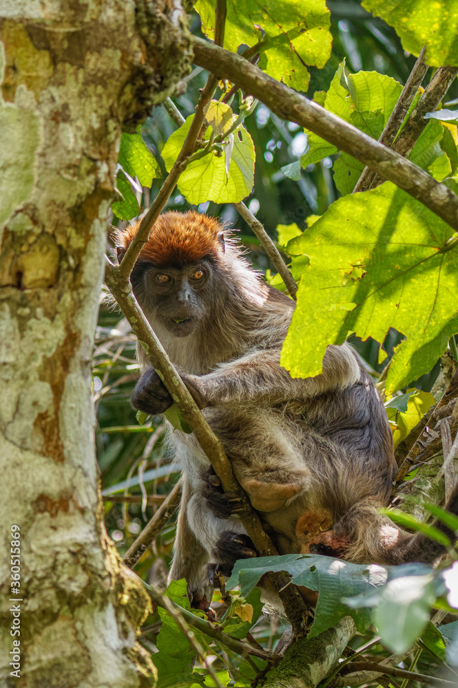 Wild ugandan red colobus monkey on the branch, Kibale National Forest, Uganda.