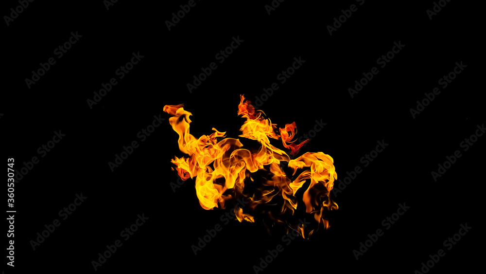 Fire flames on black background isolated. Burning gas or gasoline burns with fire and flames. Flaming burning sparks close-up, fire patterns. Infernal glow of fire in the dark with copy-space