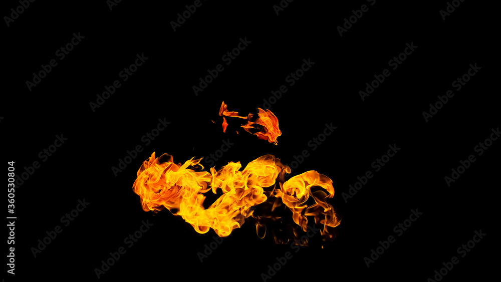 Fire flames on black background isolated. Burning gas or gasoline burns with fire and flames. Flaming burning sparks close-up, fire patterns. Infernal glow of fire in the dark with copy-space