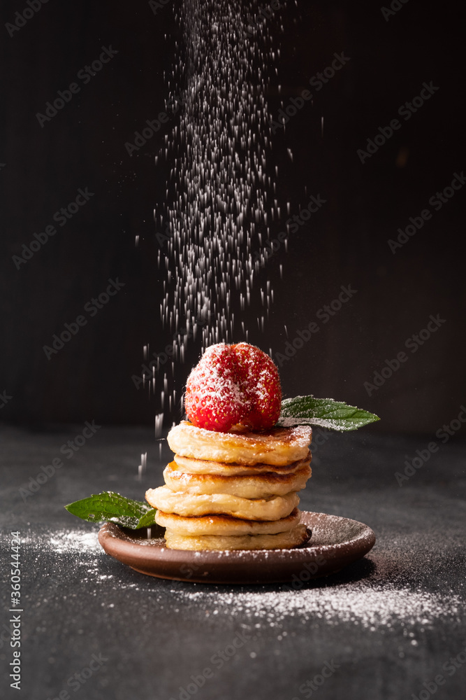 powdered sugar sprinkles on tiny flakes of pancakes with strawberries, mint and honey on a black background. Fashionable food. Mini cereal pancakes. Pancake porridge.