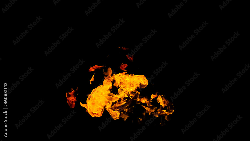 Fire flames on black background isolated. Burning gas or gasoline burns with fire and flames. Flaming burning sparks close-up, fire patterns. Infernal glow of fire in the dark with copy-space