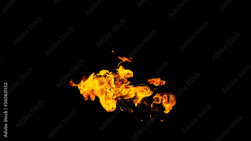 Fire flames on black background isolated. Burning gas or gasoline burns with fire and flames. Flaming burning sparks close-up, fire patterns. Infernal glow of fire in the dark with copy-space