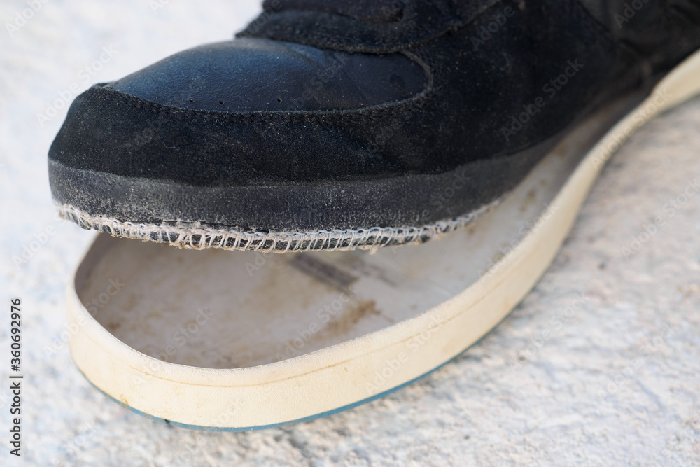 Detached sole on the sneakers.