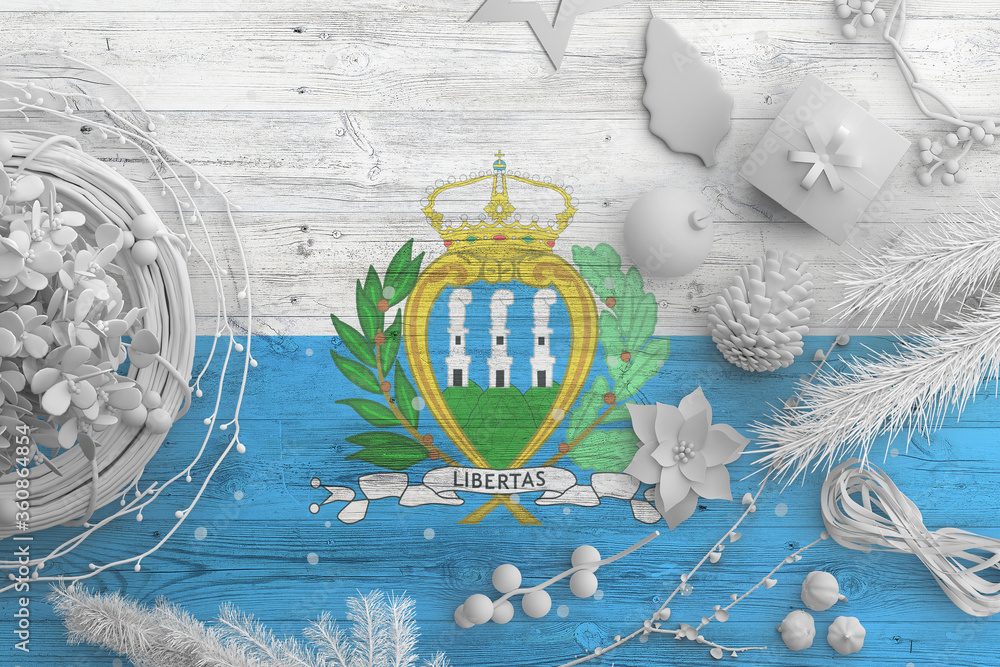 San Marino flag on wooden table with snow objects. Christmas and new year background, celebration national concept with white decor.
