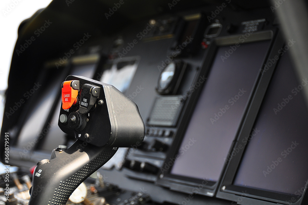 Control panel and control equipment of plane in cockpit. Plane cockpit with many function to control. monitor equipment in plane cockpit and operation by pilot and copilot in transport business.