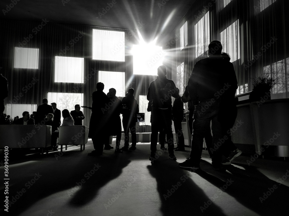 business party meeting people sunset windows talking groupe