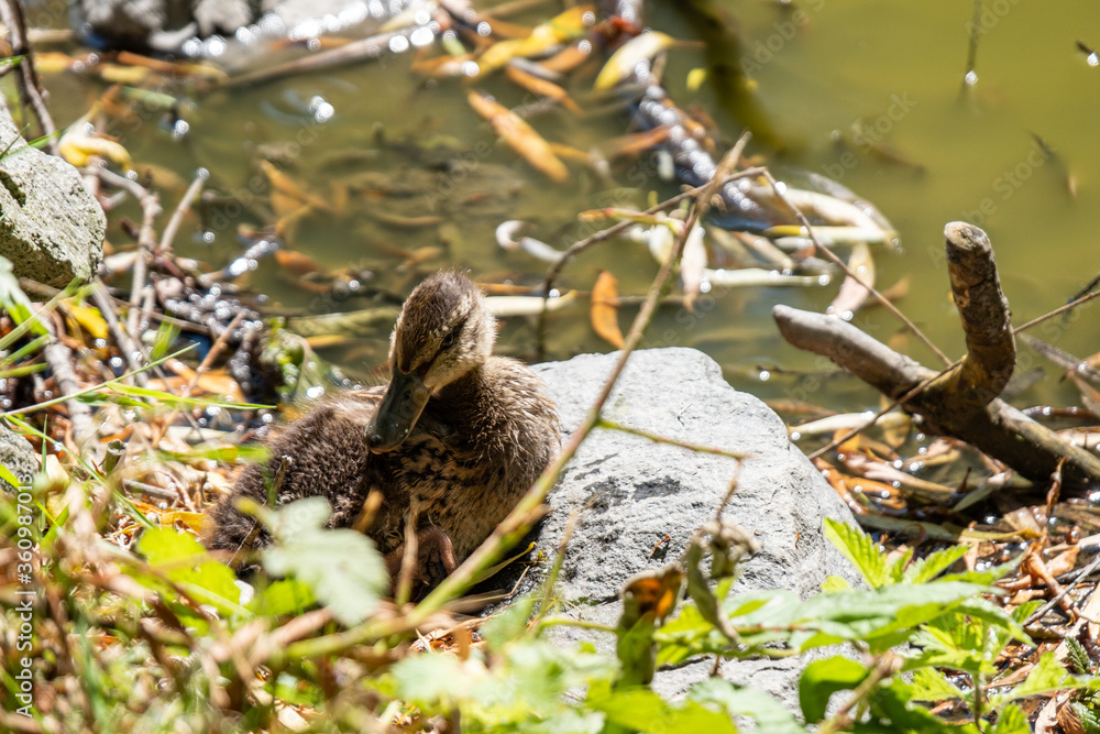 one fluffy duckling resting on the rock near the pond edge enjoy some sunshine while cleaning its feather