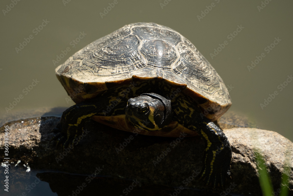 close up of a turtle resting on a piece of rock in the pond having a sun bath in the afternoon in the park