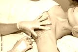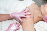 Treatment of hyperhidrosis with Botox. in the cosmetologist’s office, female hands in pink gloves inject a young woman in the armpit. healthy body concept, self-care. stop sweating and bad smell