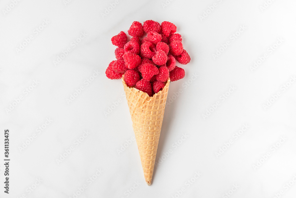 Raspberries in waffle ice cream cone on white marble background. Fresh summer berries. top view