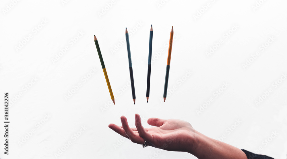 lapices de colores flotando sobre mano en fondo blanco, arte y dibujo, cuatro lapices de doble punta de colores, pinturas