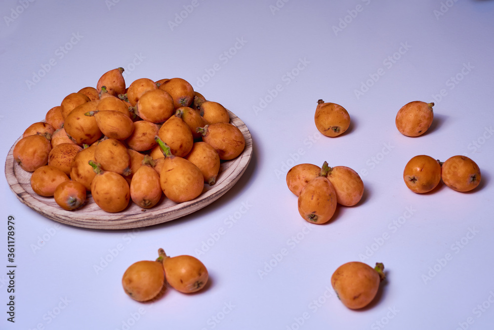 Medlars in a wooden plate and on the table